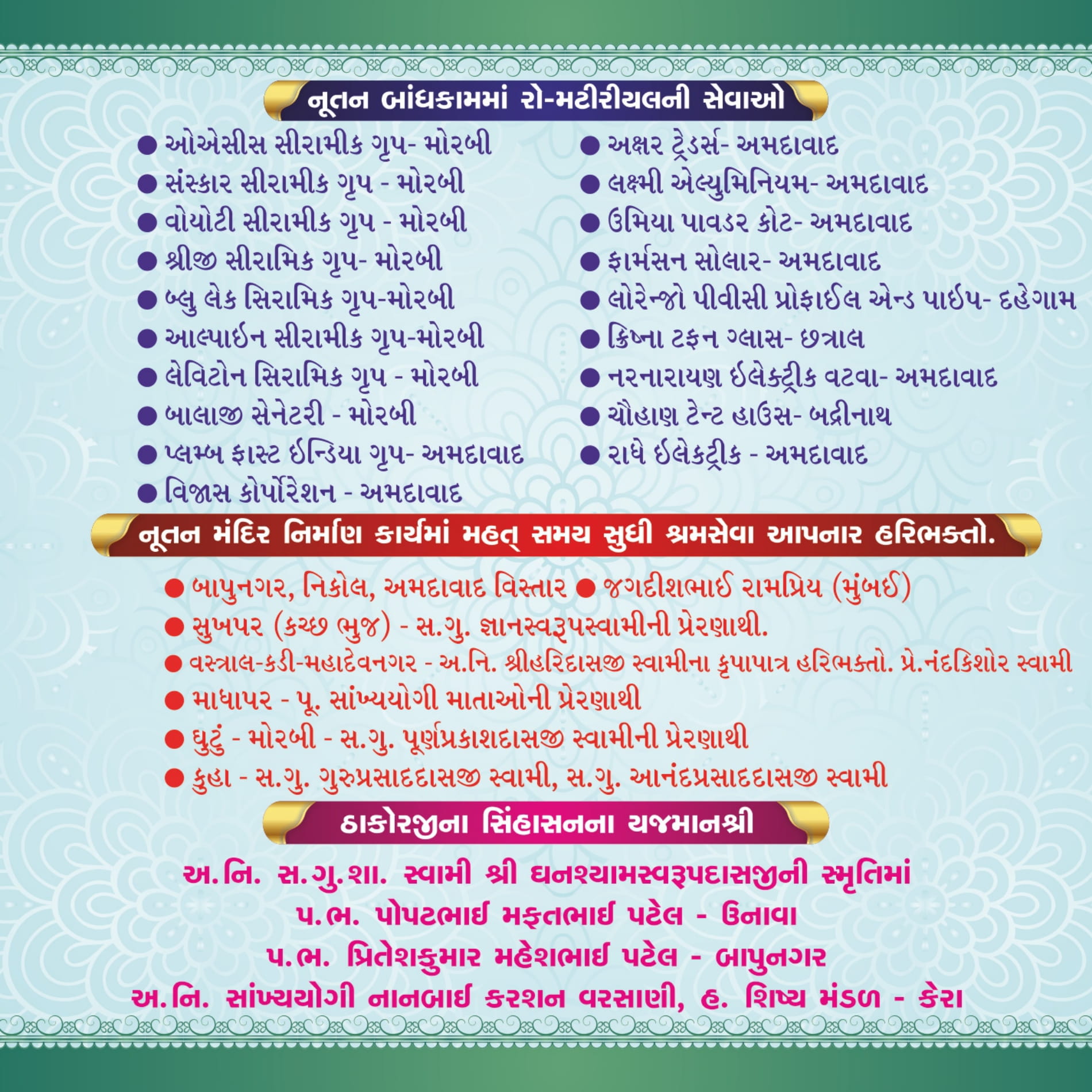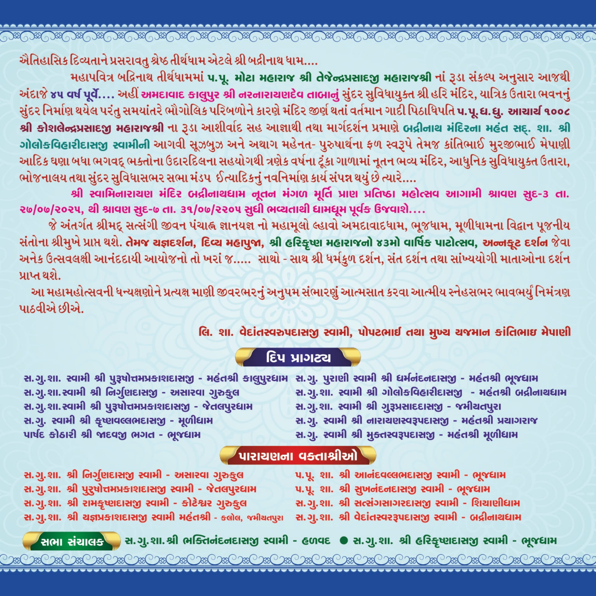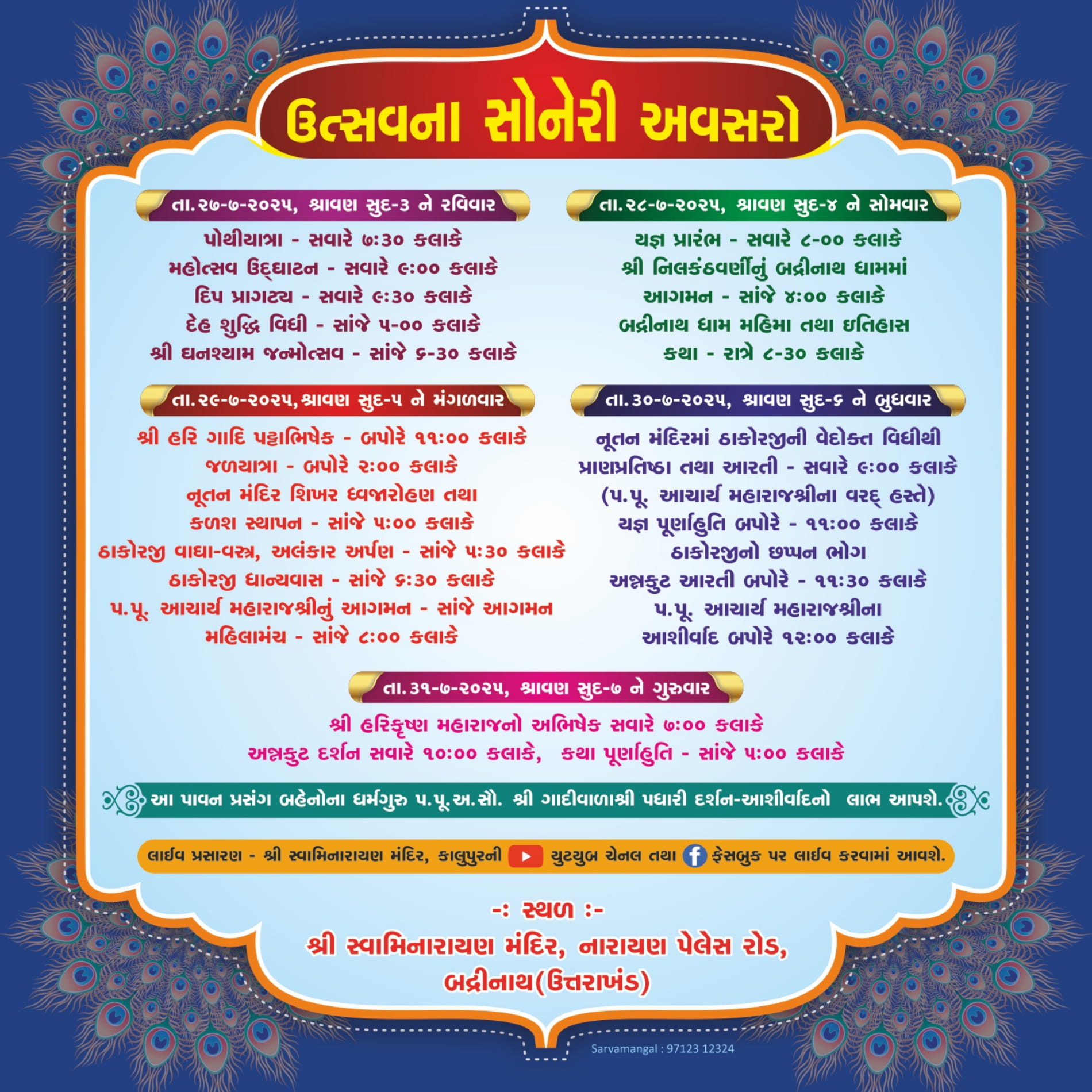 Shree Swaminarayan Badrinath will be celebrating Murti Prathishta from Sunday 27th July to Thursday 31st July 2025