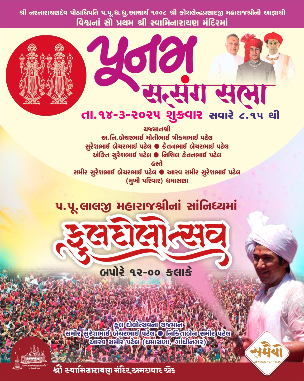 Shree Swaminarayan Mandir Kalupur will be celebrating NarNarayan Dev Jayanti, Fuldol Utsav on Friday 14th March 2025. The event will begin from 12:00PM onwards at Kalupur Mandir.