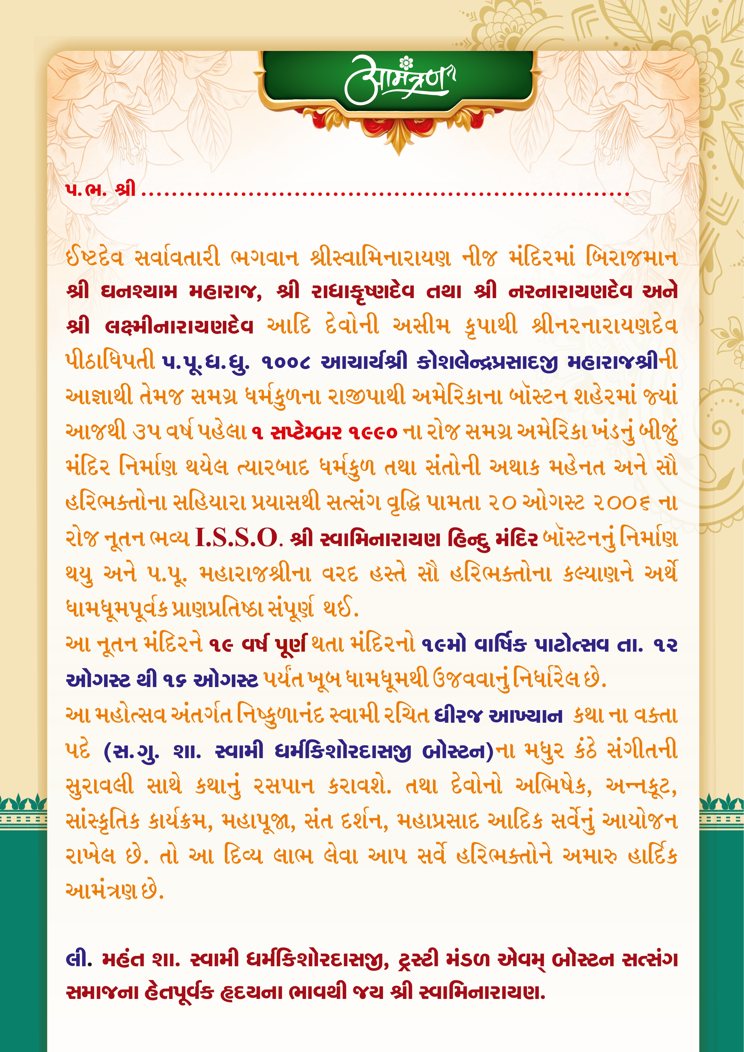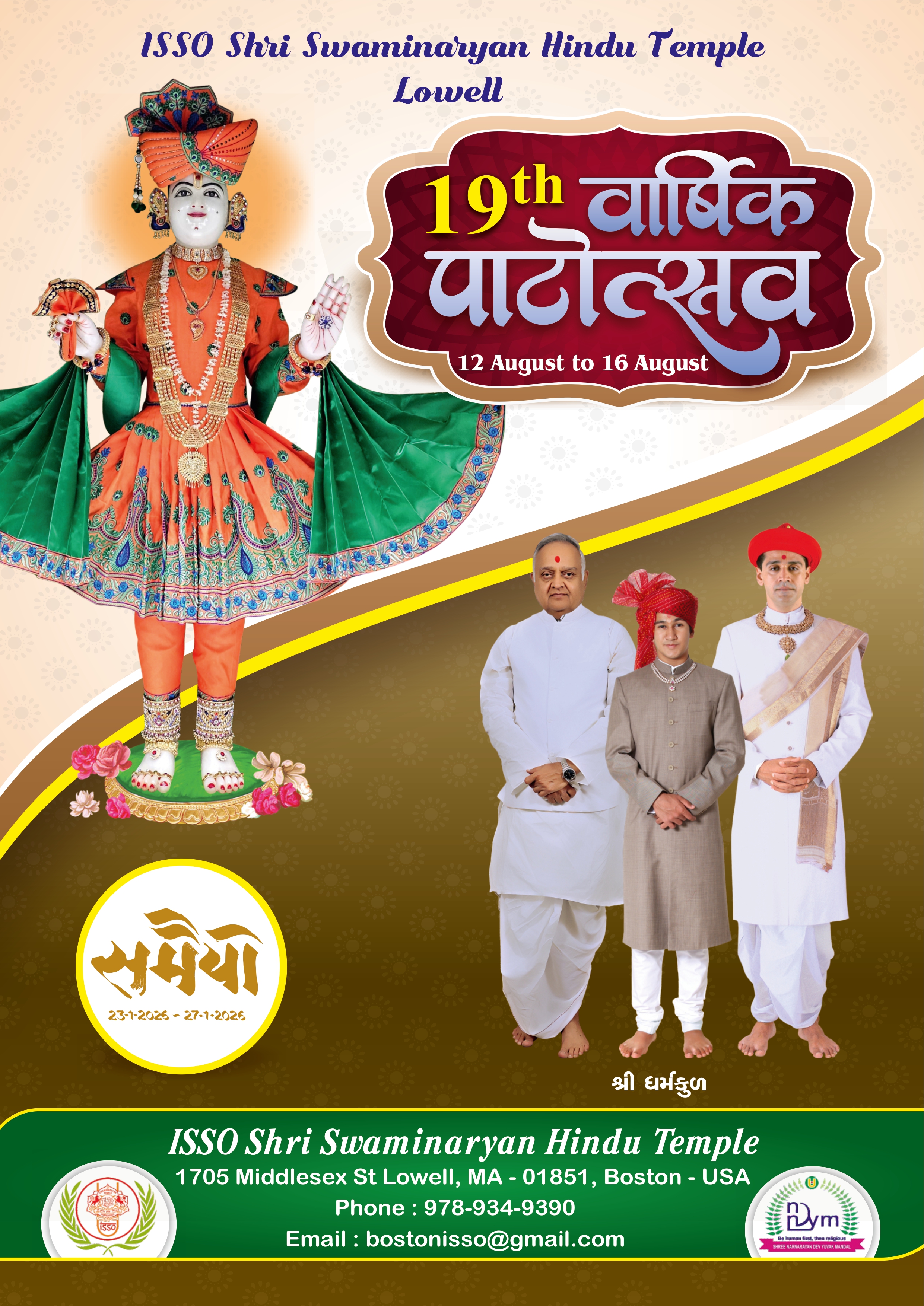 Shree Swaminarayan Mandir Boston (ISSO) will be celebrating their 19th Patotsav from Tuesday 12th August to Saturday 16th August 2025.