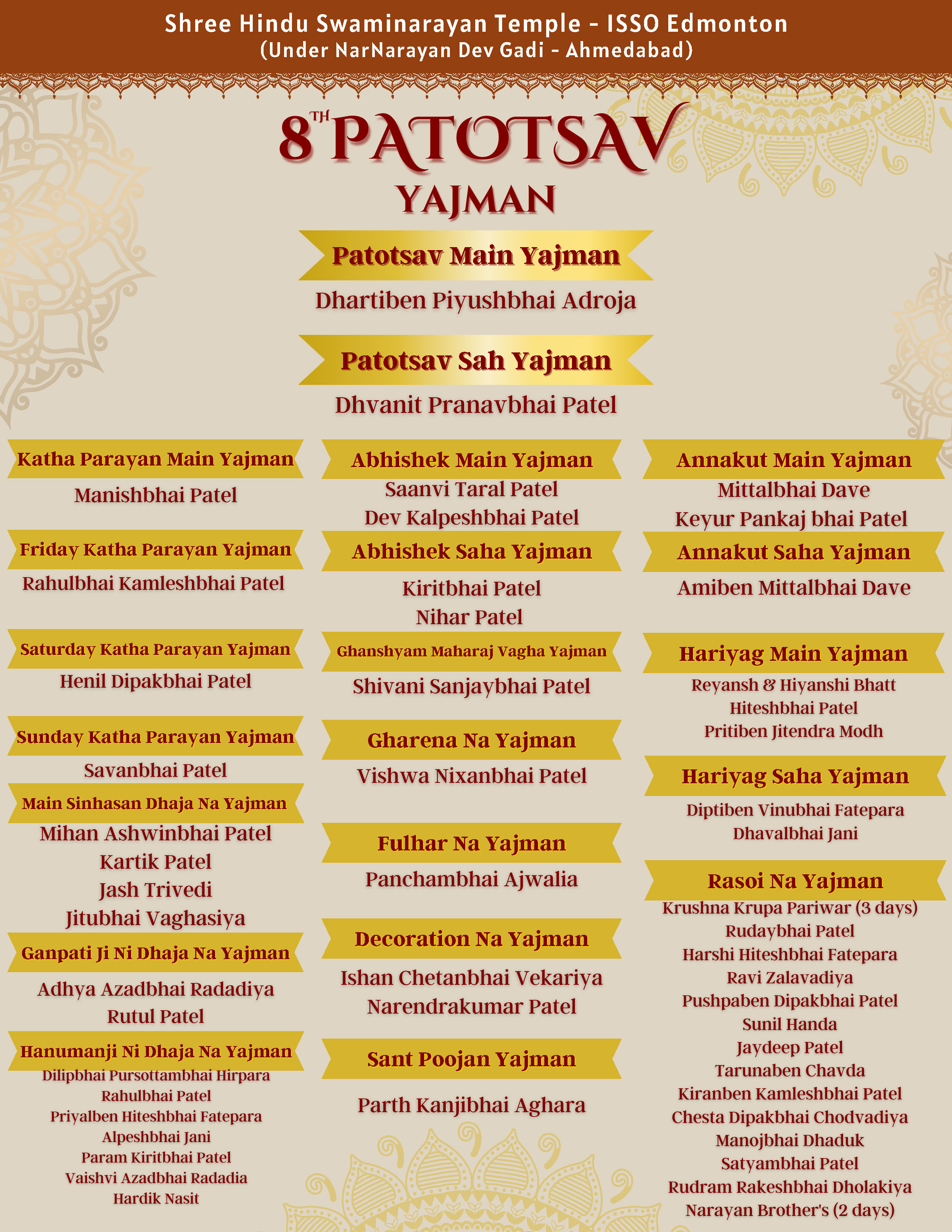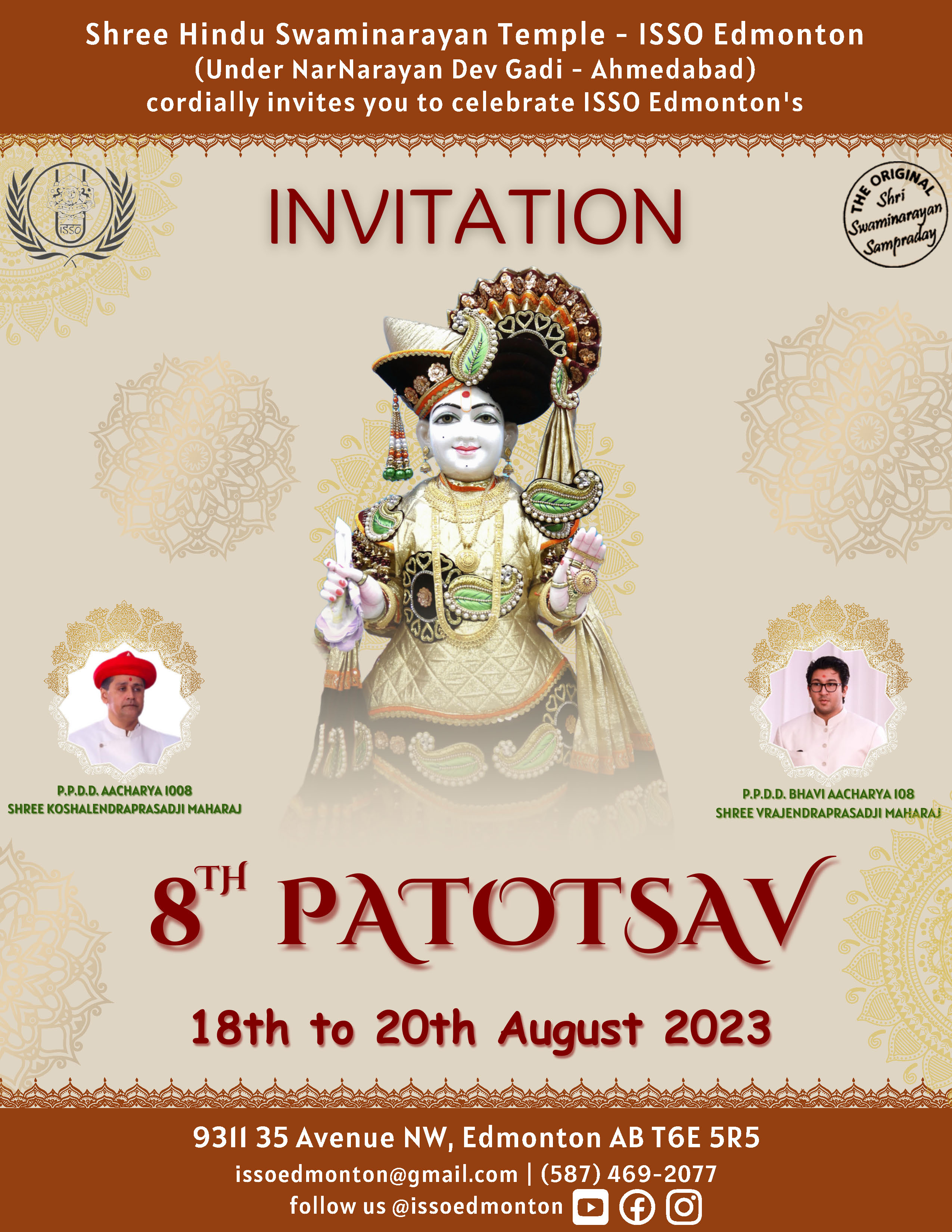 Shree Swaminarayan Mandir Edmonton, Canada will be celebrating their 8th Patotsav celebrations from Friday 18th August to Sunday 20th August 2023.