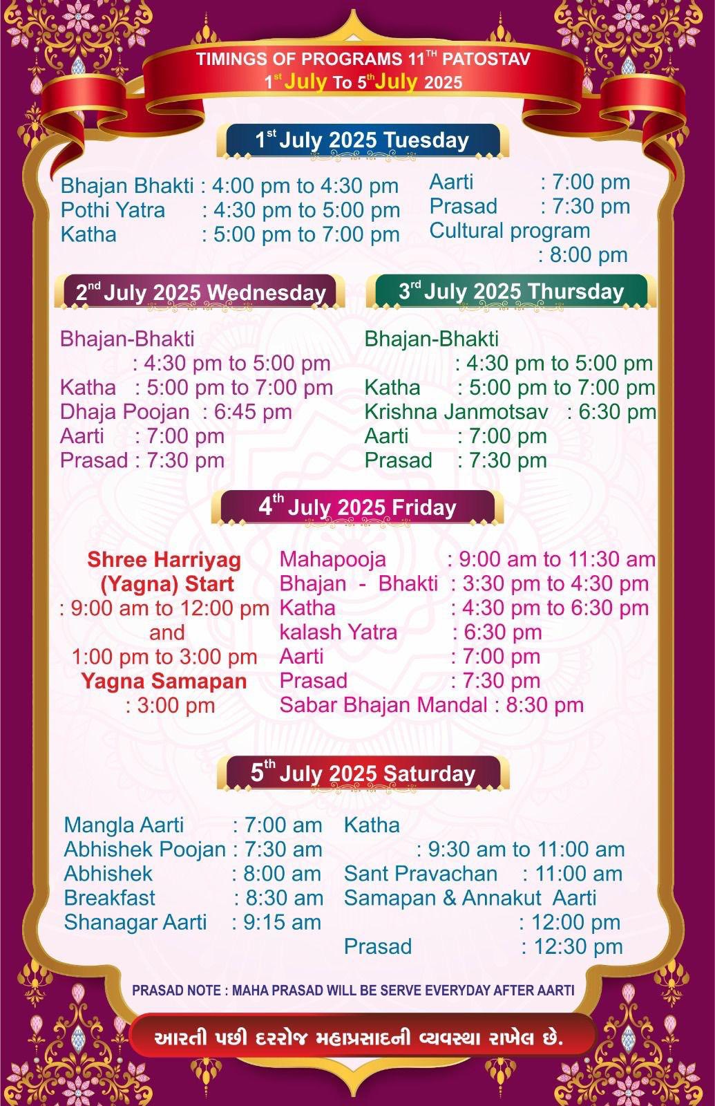 Shree Swaminarayan Mandir Louisville will be celebrating their 11th Patotsav from Tuesday 1st July to Saturday 5th July 2025. Abhishek will be performed on Saturday 5th July 2025 from 7:30AM followed by Ankoot darshan at 12:00PM. Please see poster for full details.