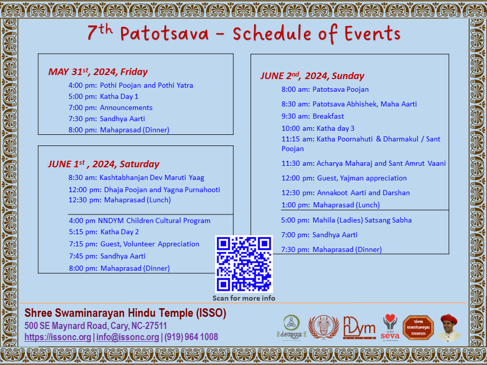 Shree Swaminarayan Mandir Raleigh, North Carolina (ISSO) will be celebrating their 7th Patotsav celebrations from Friday 31st May to Sunday 2nd June 2024 in the presence of H.H Acharya Maharajshree Koshalendraprasadji Maharaj