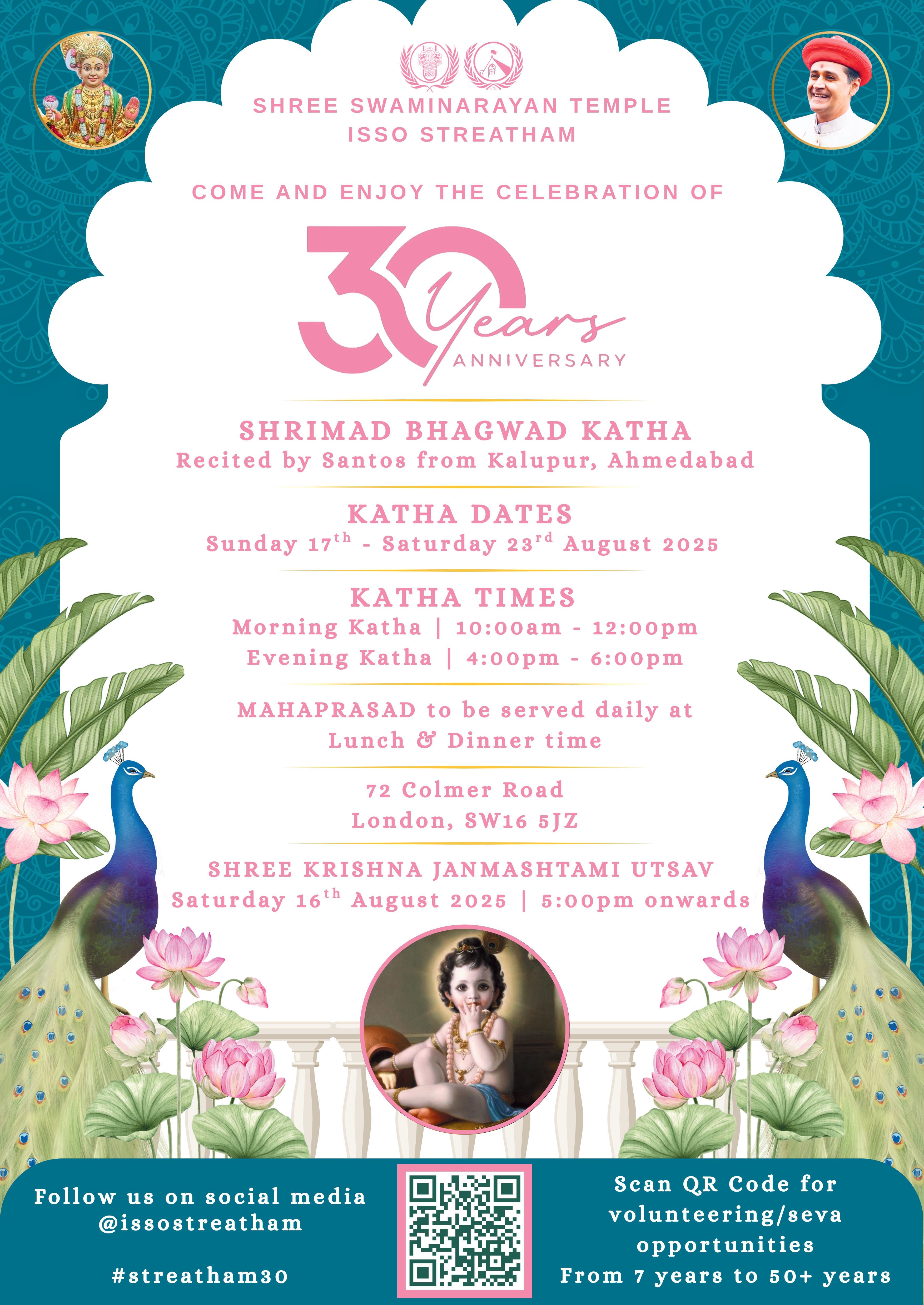 Shree Swaminarayan Mandir Streatham (ISSO) will be celebrating their 30th Patotsav from Sunday 17th August to Saturday 23rd August 2025