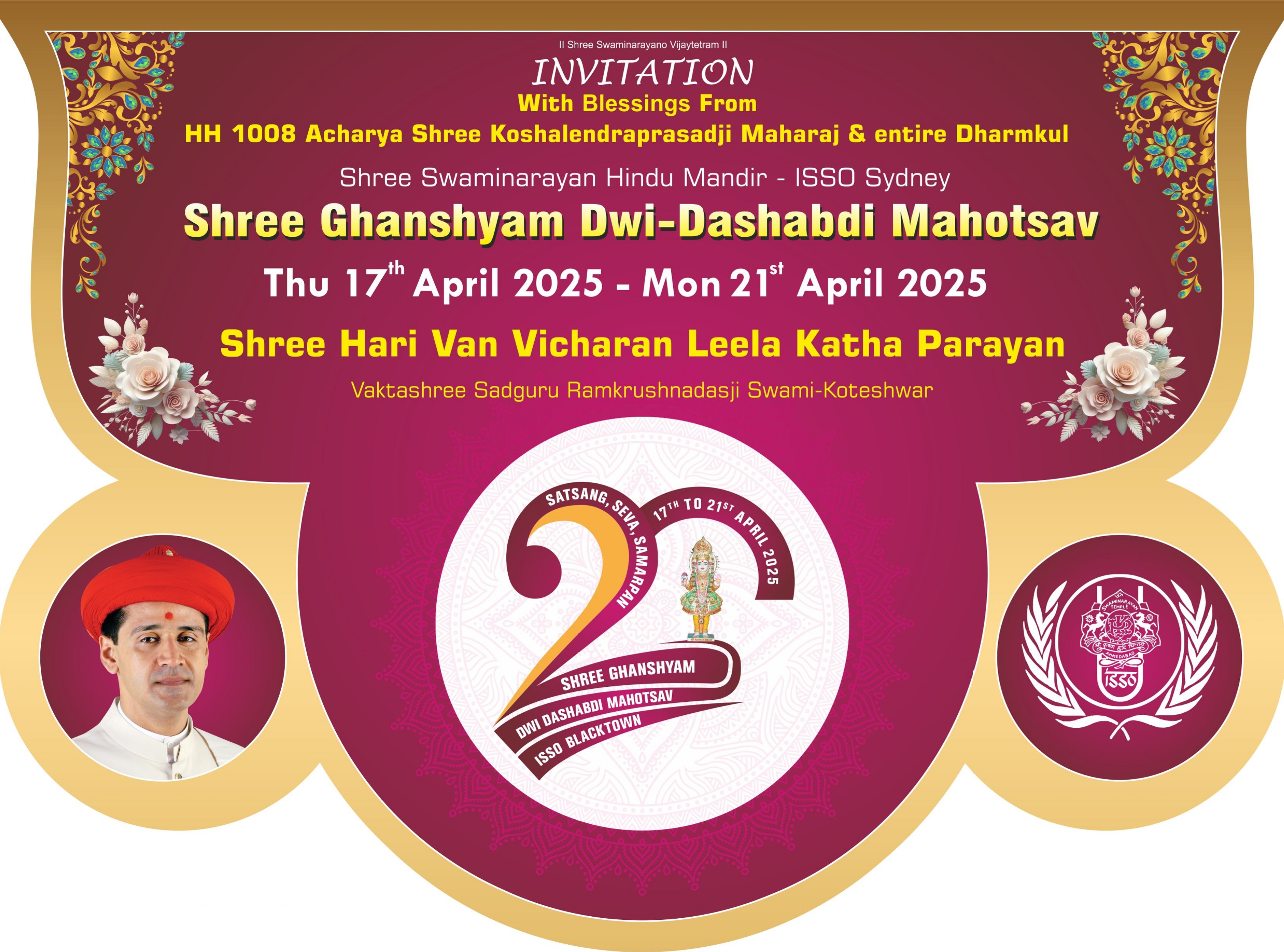 Shree Swaminarayan Mandir Sydney (ISSO) will be celebrating their 20th Patotsav from Thursday 17th April to Monday 21st April 2025