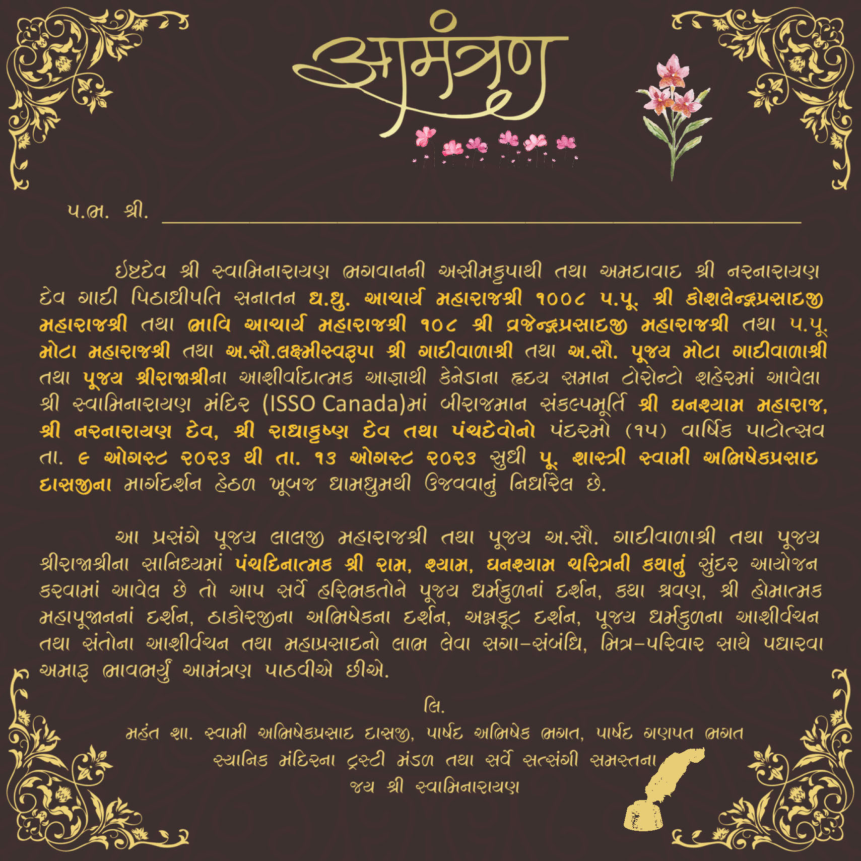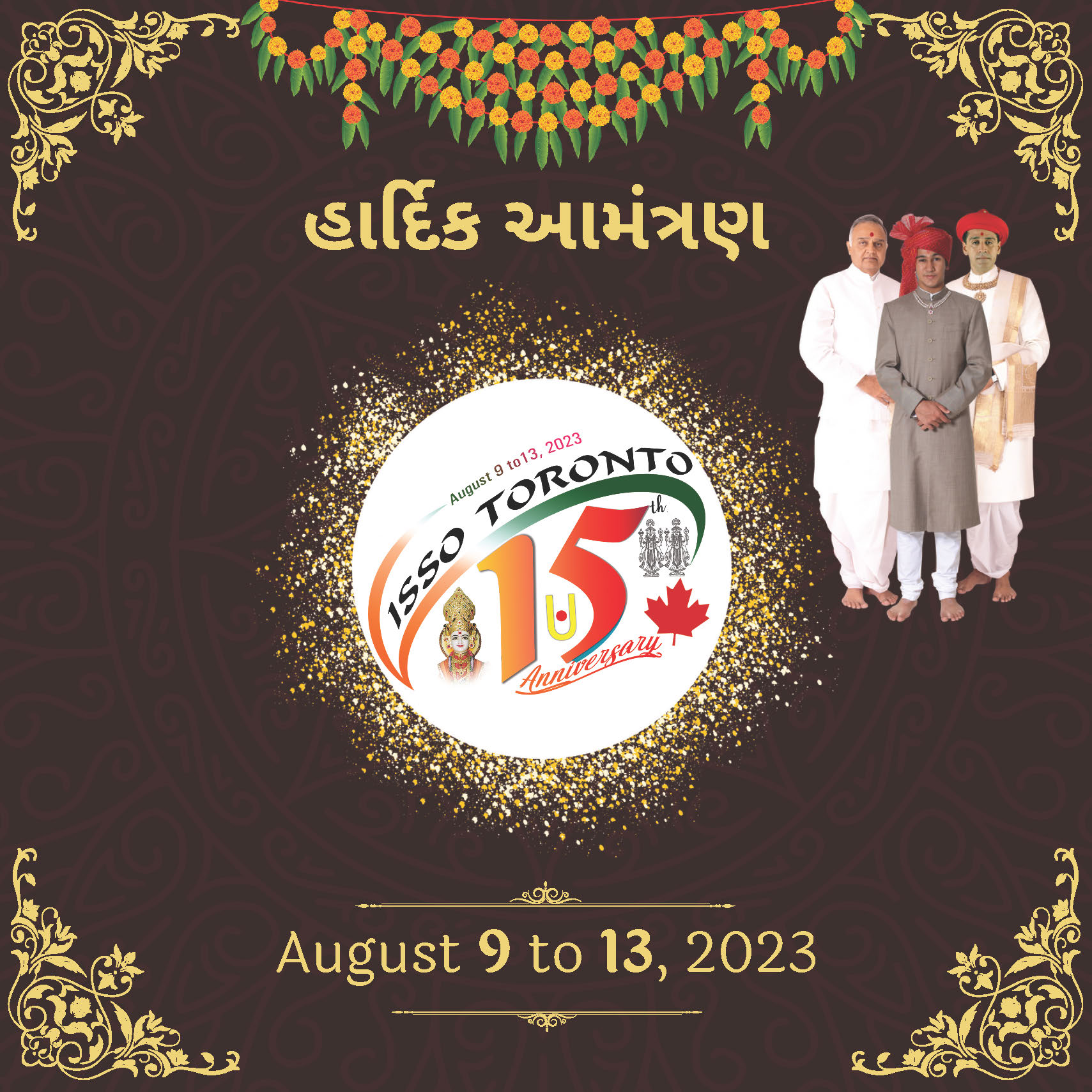 Shree Swaminarayan Mandir Toronto will be celebrating their 15th Patotsav from Wednesday 9th August to Sunday 13th August 2023. Abhishek will be performed by H.H 108 Lalji Maharajshri Vrajendraprasadji Maharaj on Sunday 13th August 2023