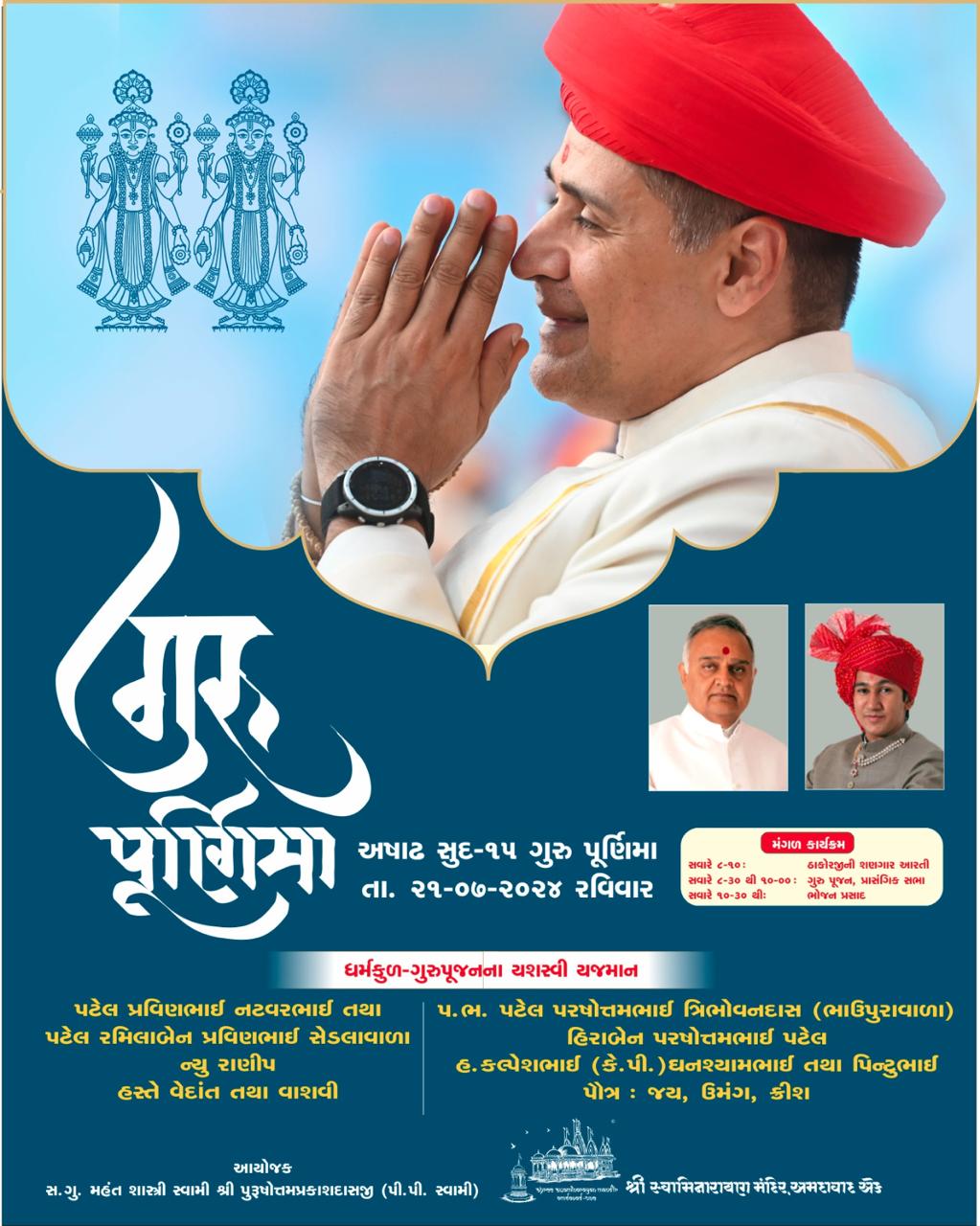 Shree Swaminarayan Mandir Kalupur and other Mandir's worldwide will be celebrating Guru Poornima Mahotsav on Sunday 21st July 2024