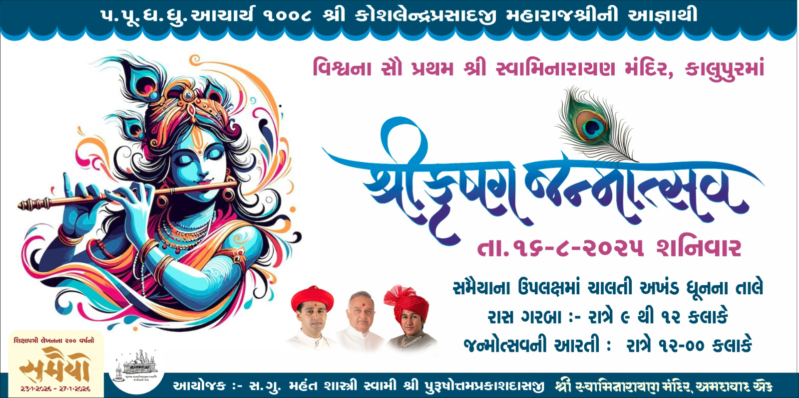 Shree Swaminarayan Mandir Kalupur will celebrate Shree Krishna Janmashtami on Saturday 16th August 2025.