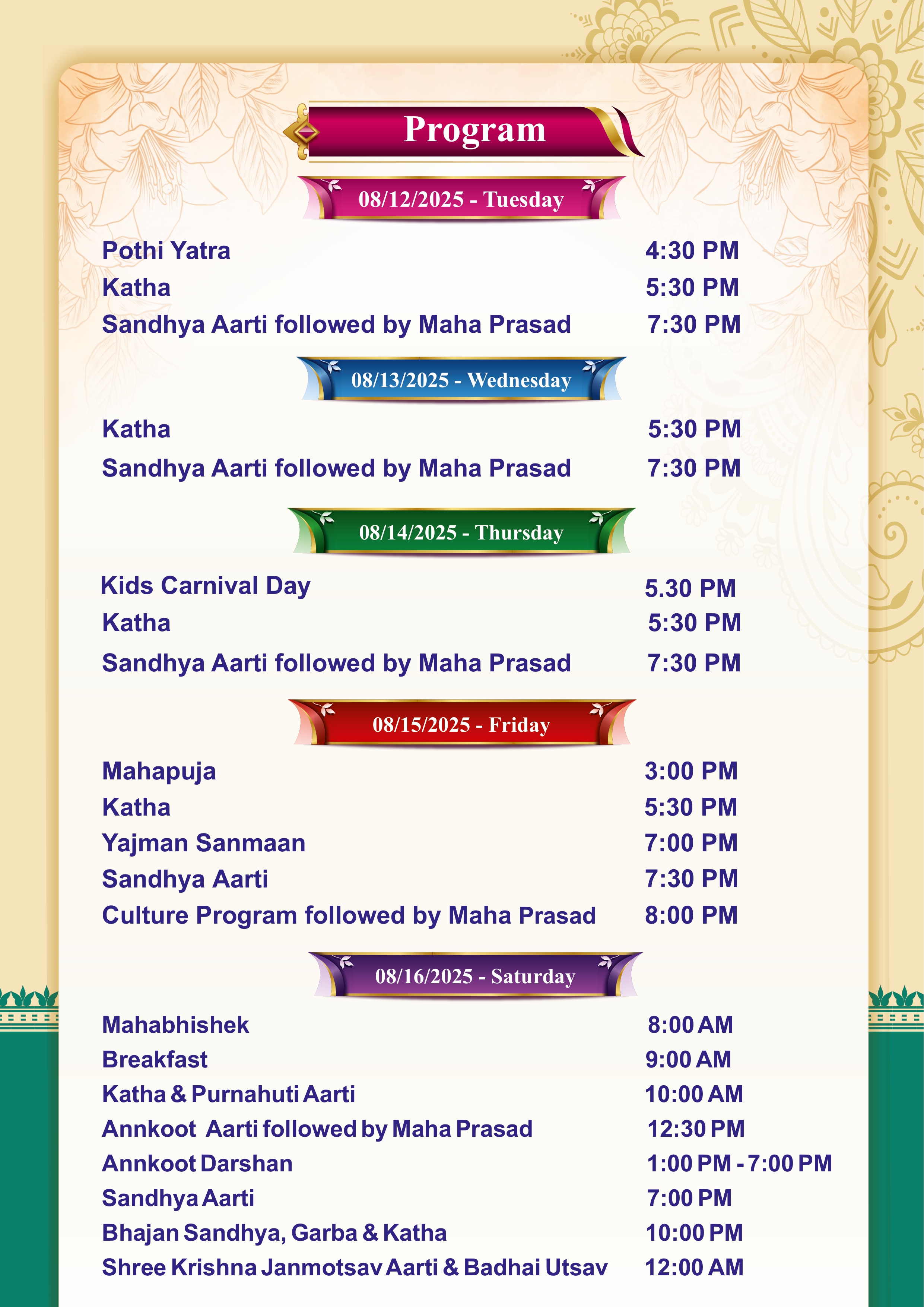 • Shree Krishna Janmotsav Aarti & Badhai Utsav12:00 AM