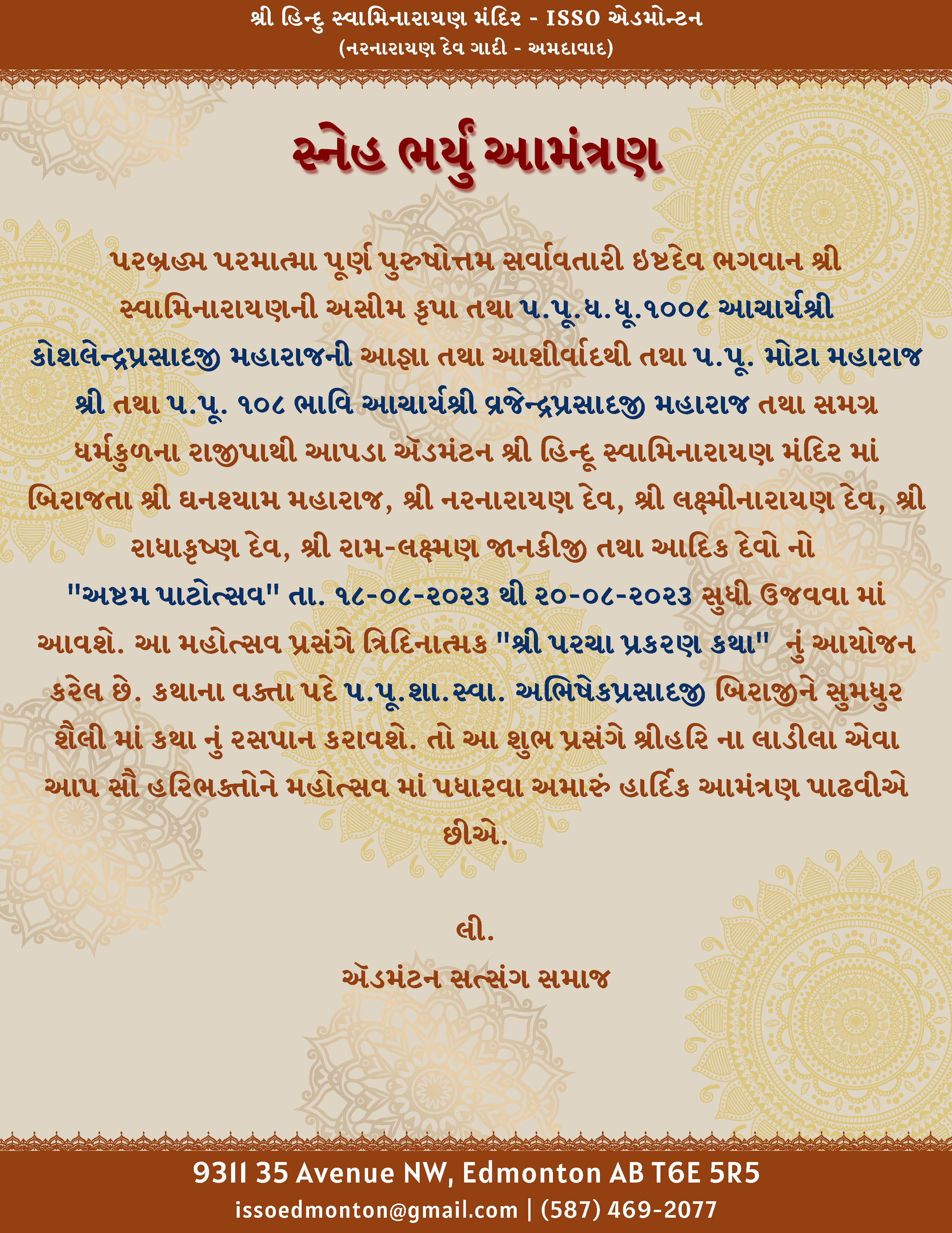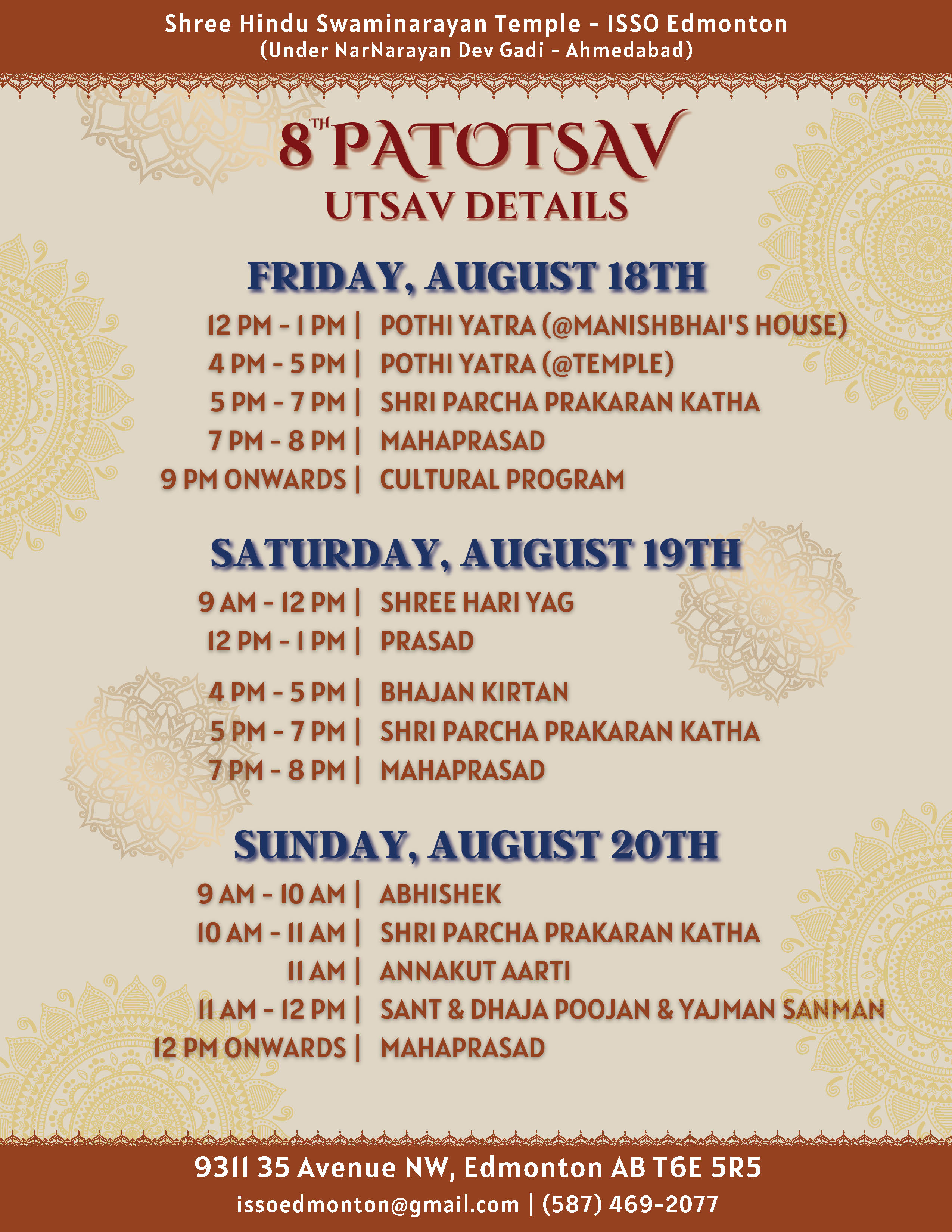 Shree Swaminarayan Mandir Edmonton, Canada will be celebrating their 8th Patotsav celebrations from Friday 18th August to Sunday 20th August 2023.