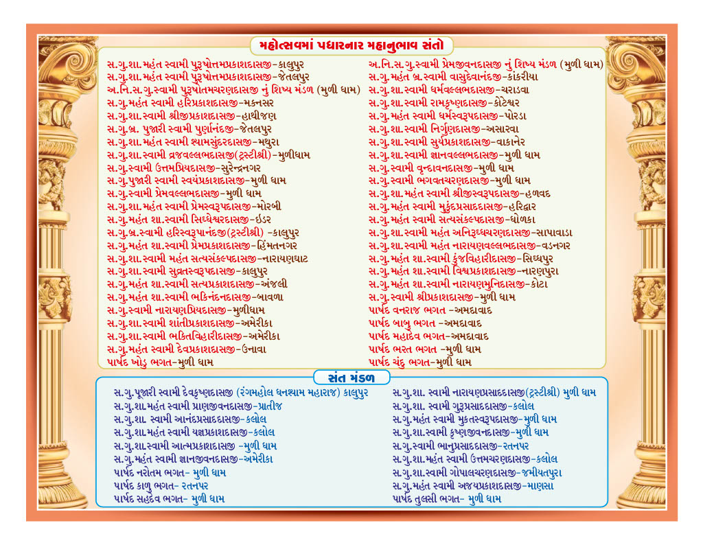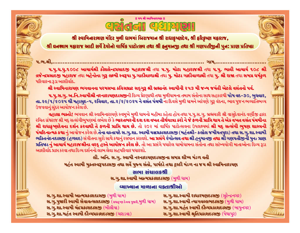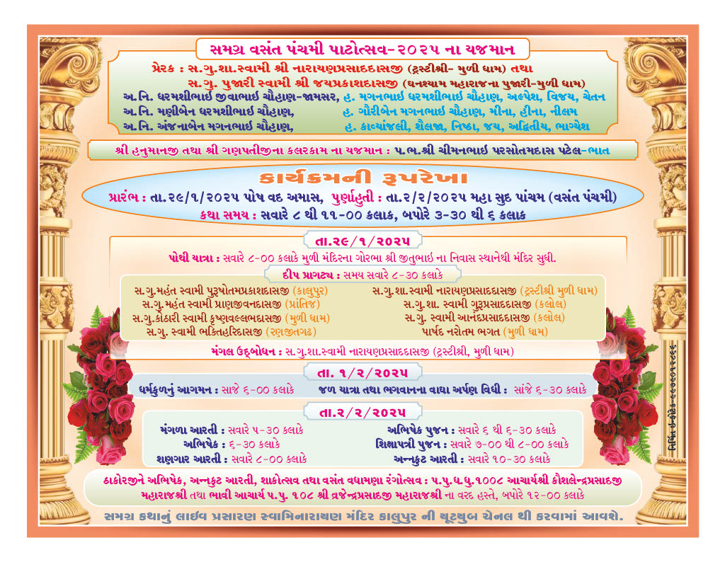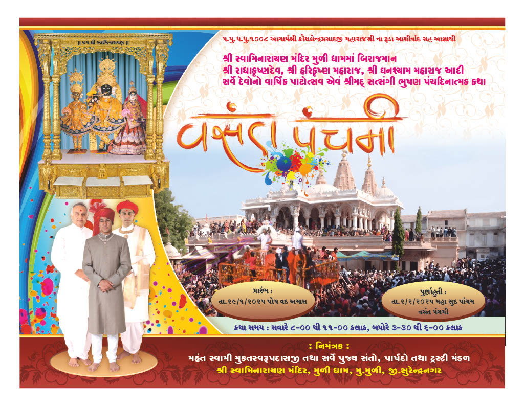 Shree Swaminarayan Mandir Muli will celebrate 202nd Patotsav from Wednesday 29th January to Sunday 2nd February 2025 and Shreemad Satsangi Bhushan Katha will be recited.