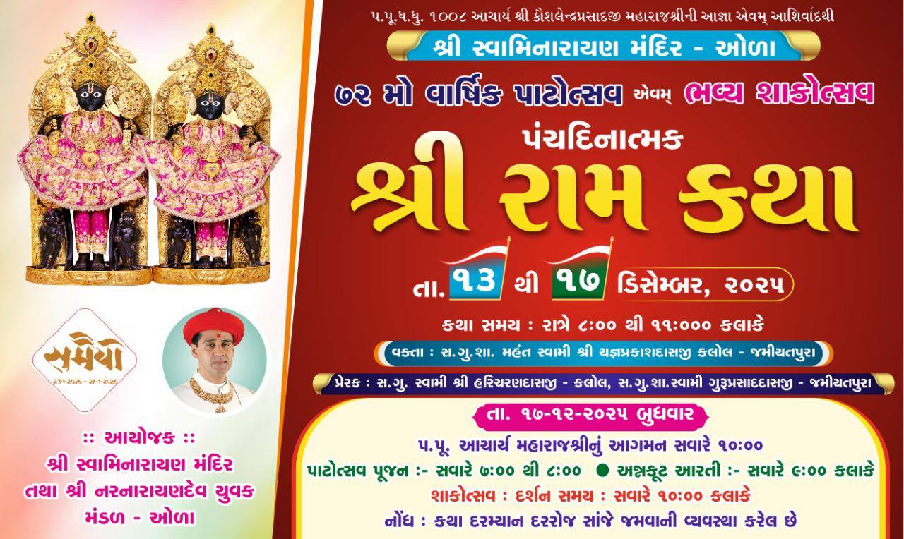 Shree Swaminarayan Mandir Ora will celebrate their 72nd Patotsav and Shree Ram Katha will be recited from Saturday 13th December to Wednesday 17th December 2025