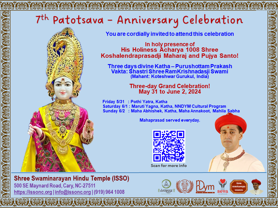 Shree Swaminarayan Mandir Raleigh, North Carolina (ISSO) will be celebrating their 7th Patotsav celebrations from Friday 31st May to Sunday 2nd June 2024 in the presence of H.H Acharya Maharajshree Koshalendraprasadji Maharaj