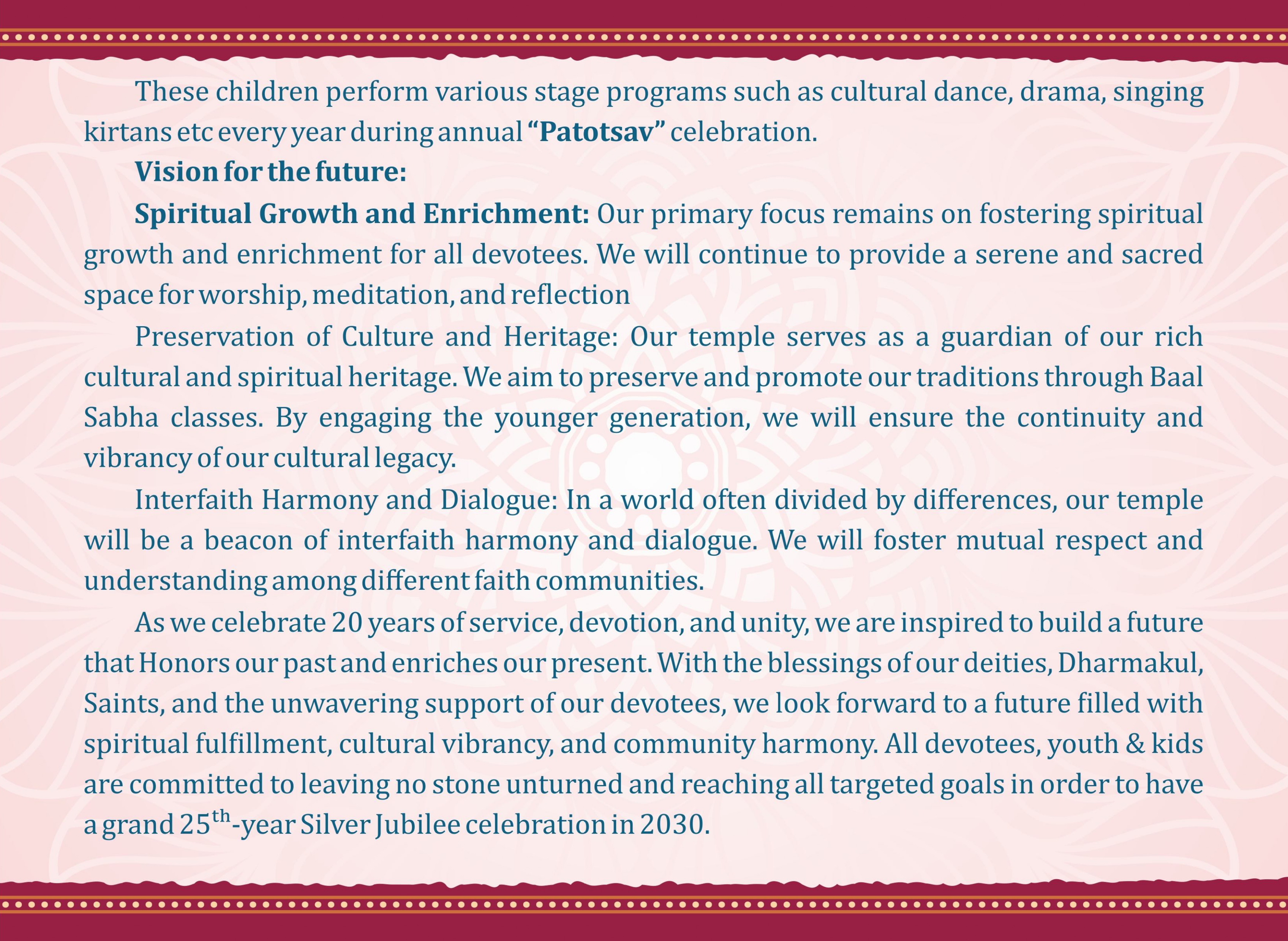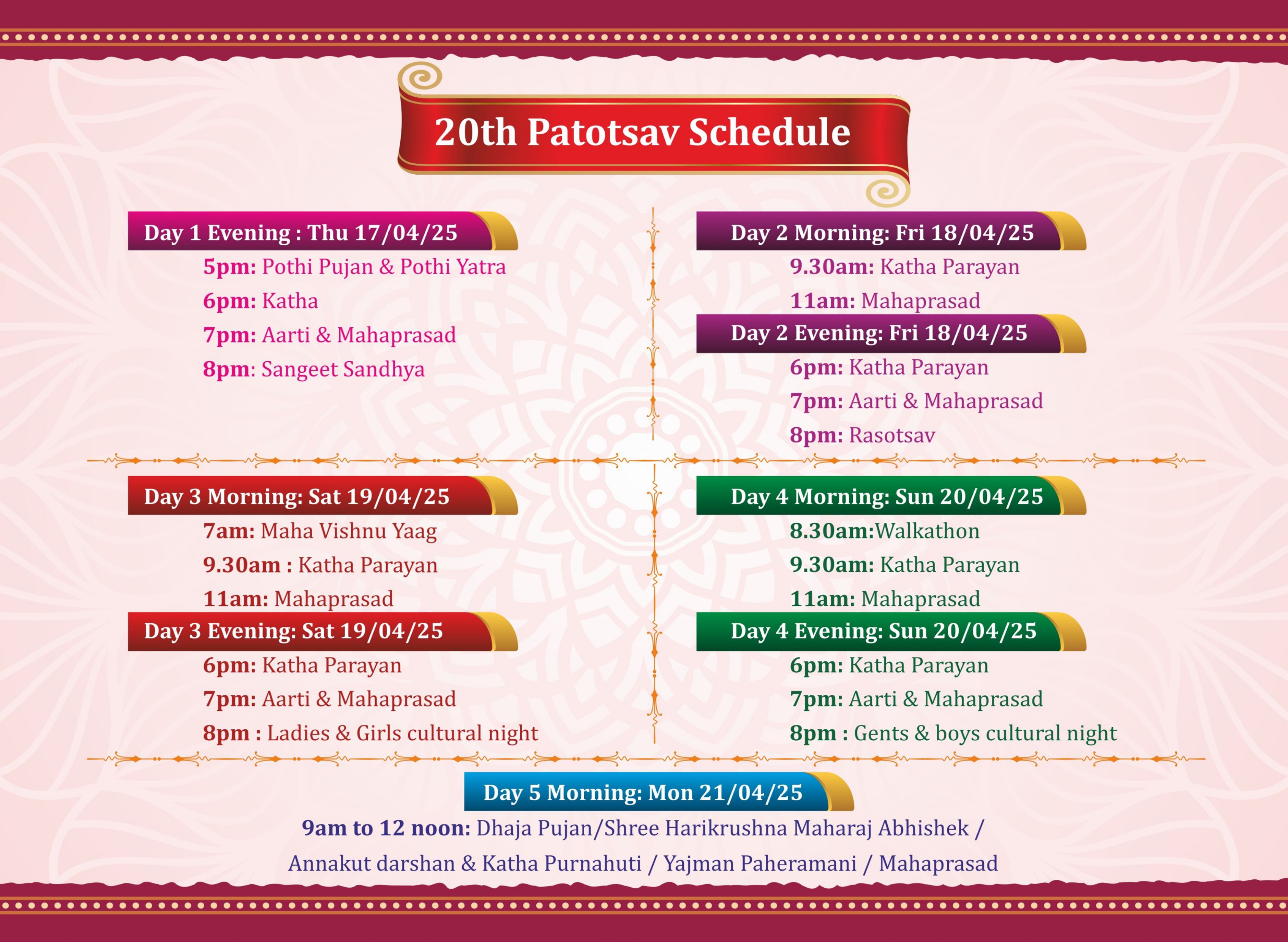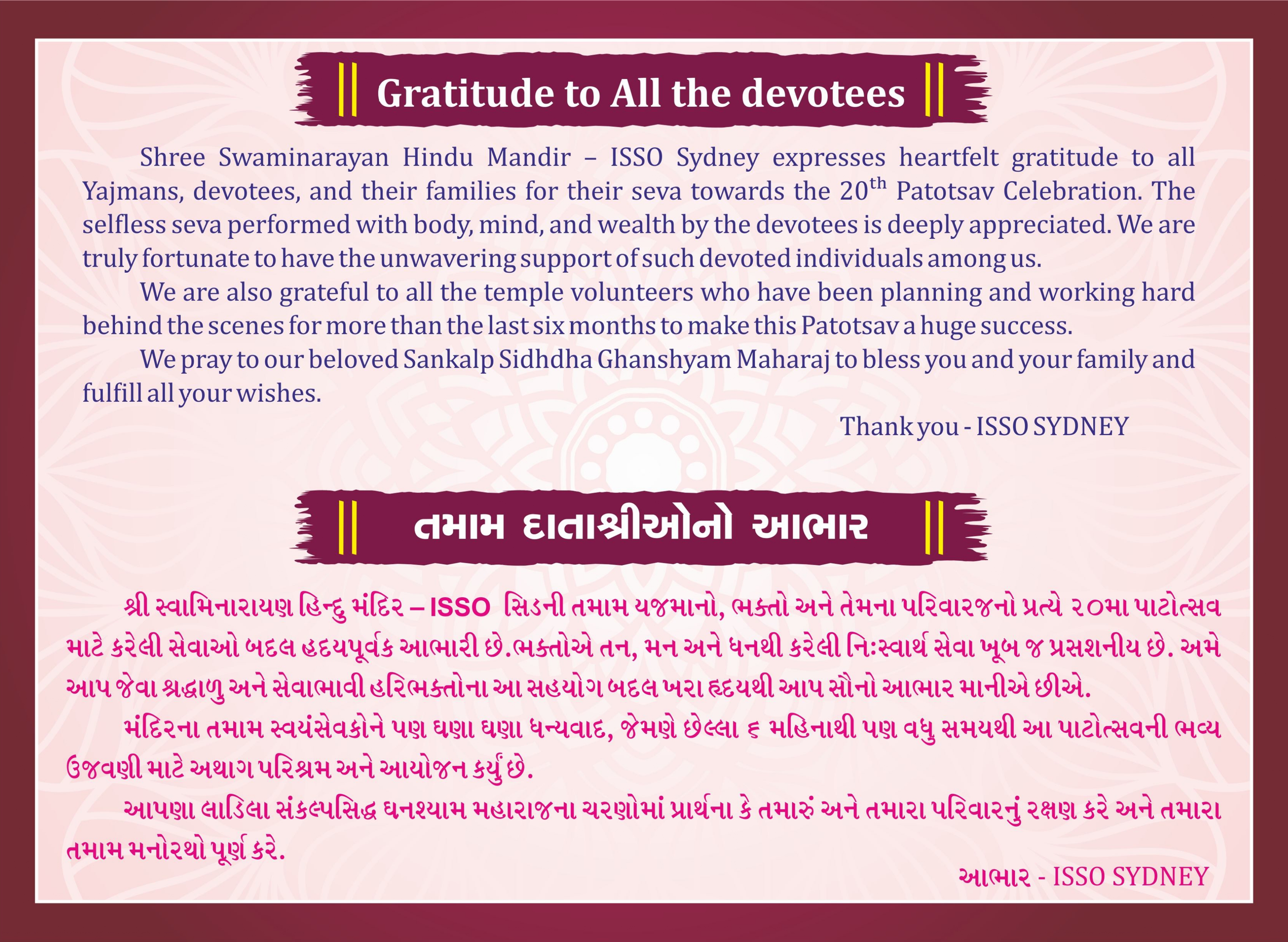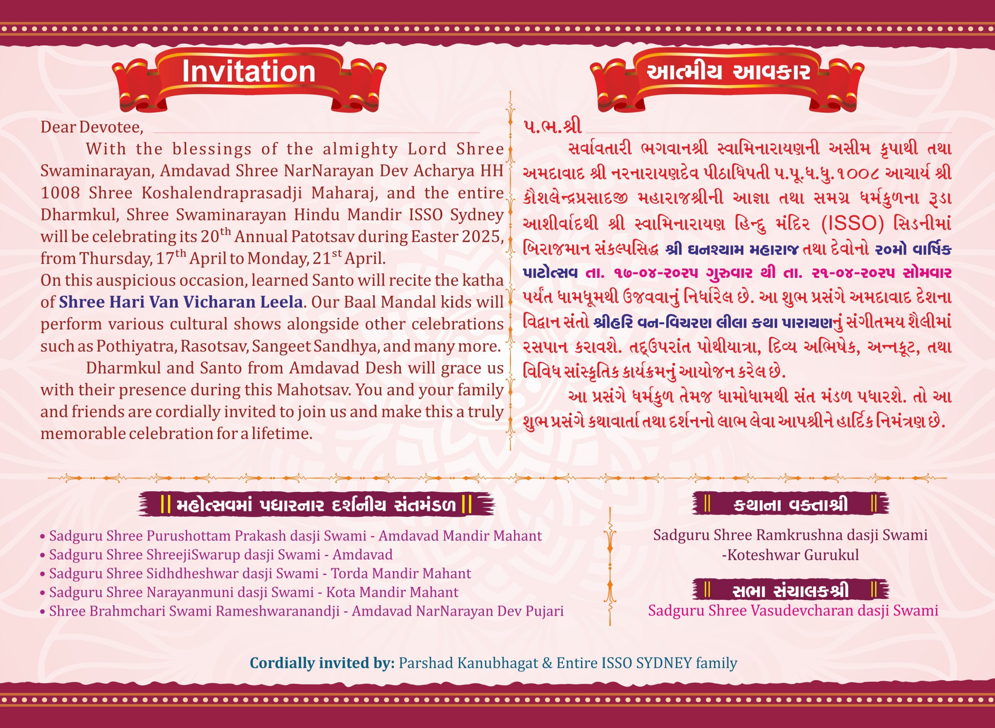 Shree Swaminarayan Mandir Sydney (ISSO) will be celebrating their 20th Patotsav from Thursday 17th April to Monday 21st April 2025