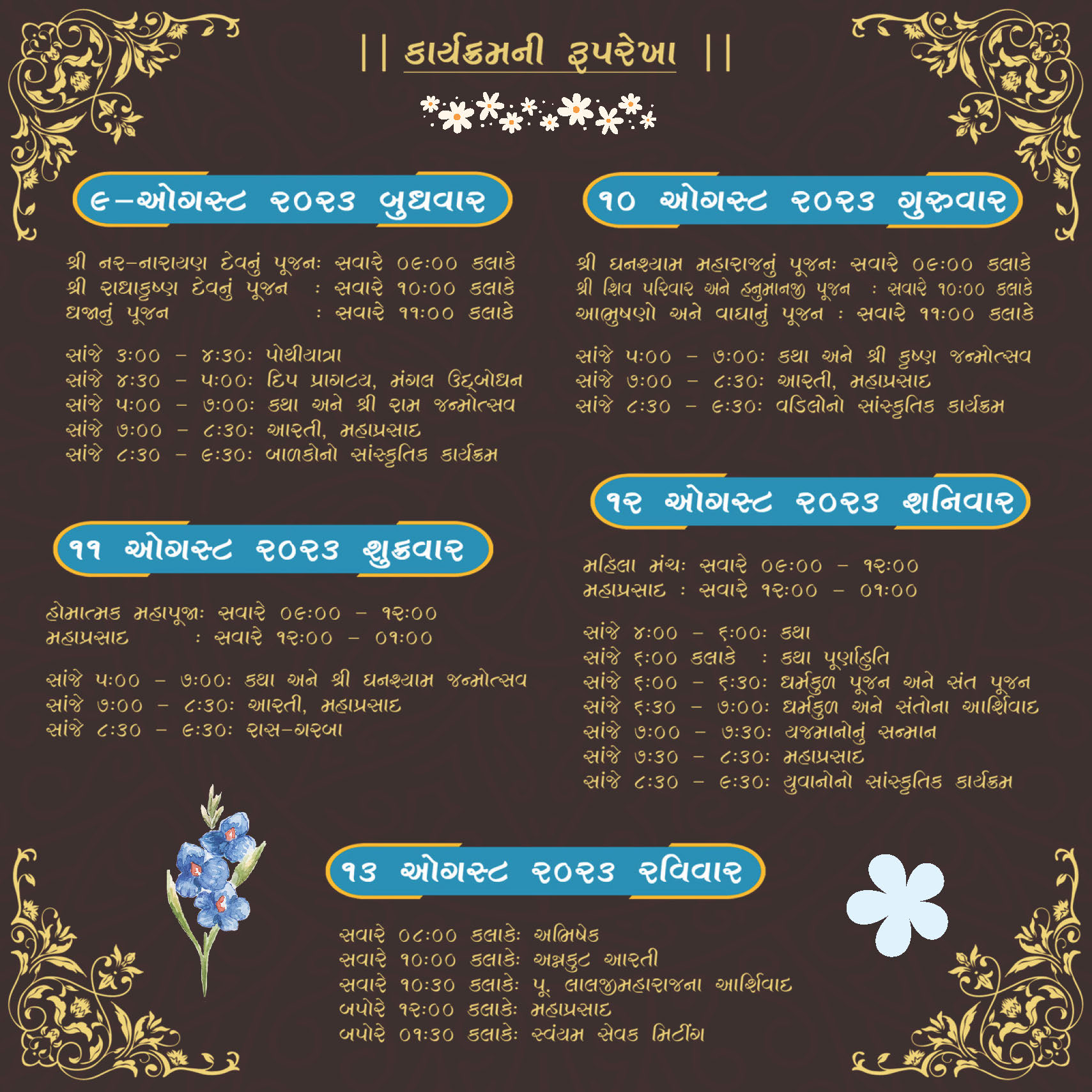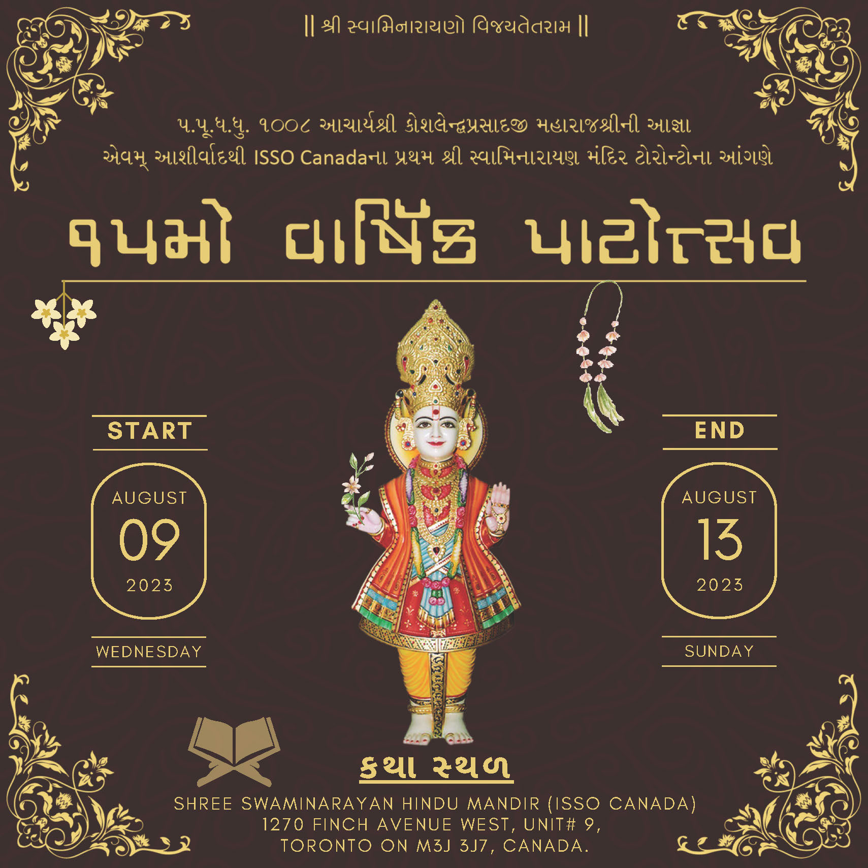 Shree Swaminarayan Mandir Toronto will be celebrating their 15th Patotsav from Wednesday 9th August to Sunday 13th August 2023. Abhishek will be performed by H.H 108 Lalji Maharajshri Vrajendraprasadji Maharaj on Sunday 13th August 2023